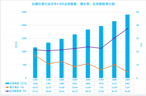 2.9 儀器儀表行業(yè)歷年1-9月應(yīng)收賬款、增長(zhǎng)率、應(yīng)收賬款率比較