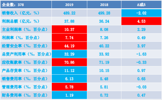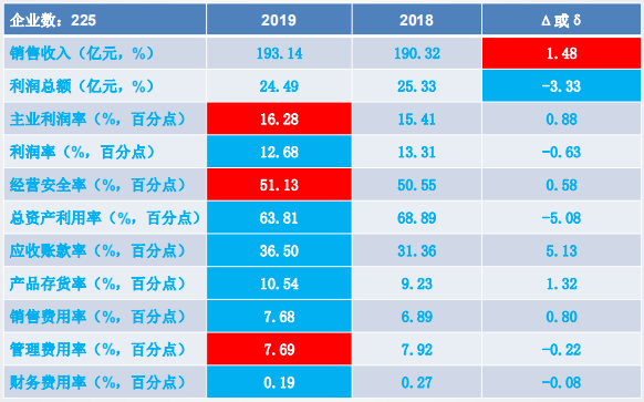 11個(gè)經(jīng)濟(jì)運(yùn)行指標(biāo)中:銷售收入、利潤(rùn)總額、主業(yè)利潤(rùn)率、經(jīng)營(yíng)安全率、應(yīng)收賬款率、產(chǎn)品存貨率和管理費(fèi)用率好于上年同期;其余4個(gè)指標(biāo)差于上年同期。